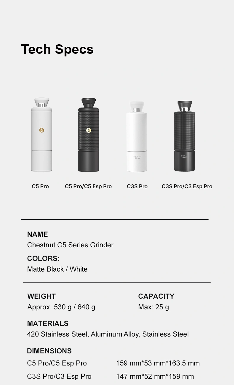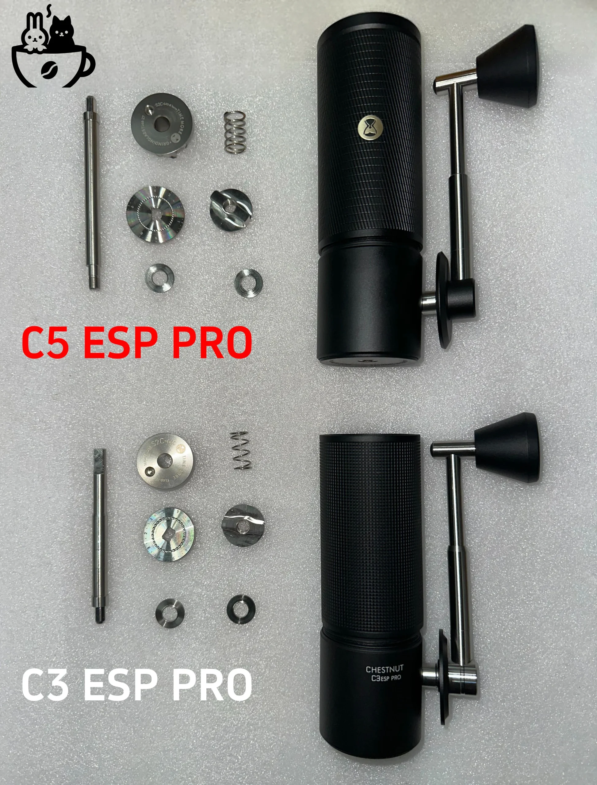 TIMEMORE C5 ESP Pro manual coffee grinder upgraded to all-metal one-piece enlarged body and finer adjustment pitch. It is made of CNC machining stainless steel conical burr. Double bearing central axis positioning-uniform grinding particles. Burr size 42 mm-efficient grinding of coffee beans