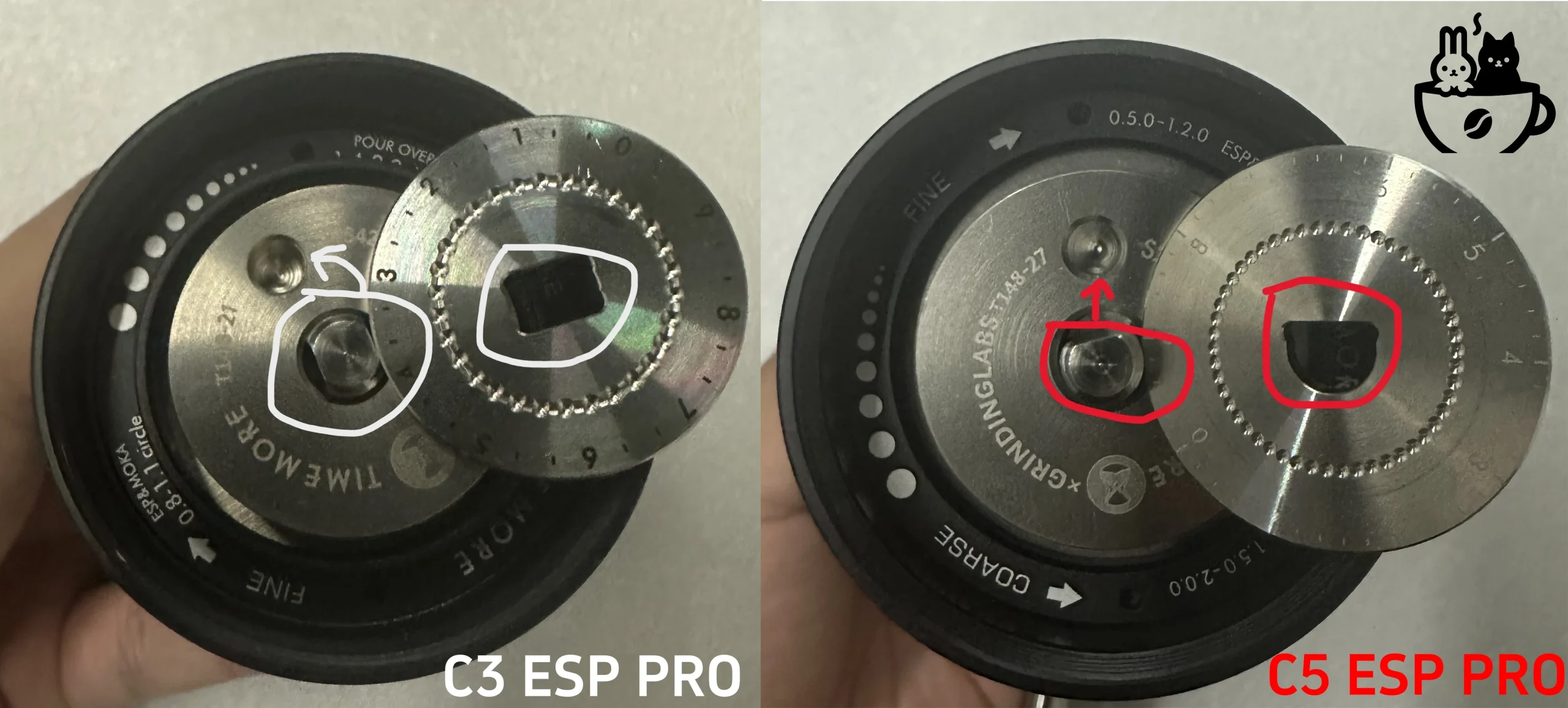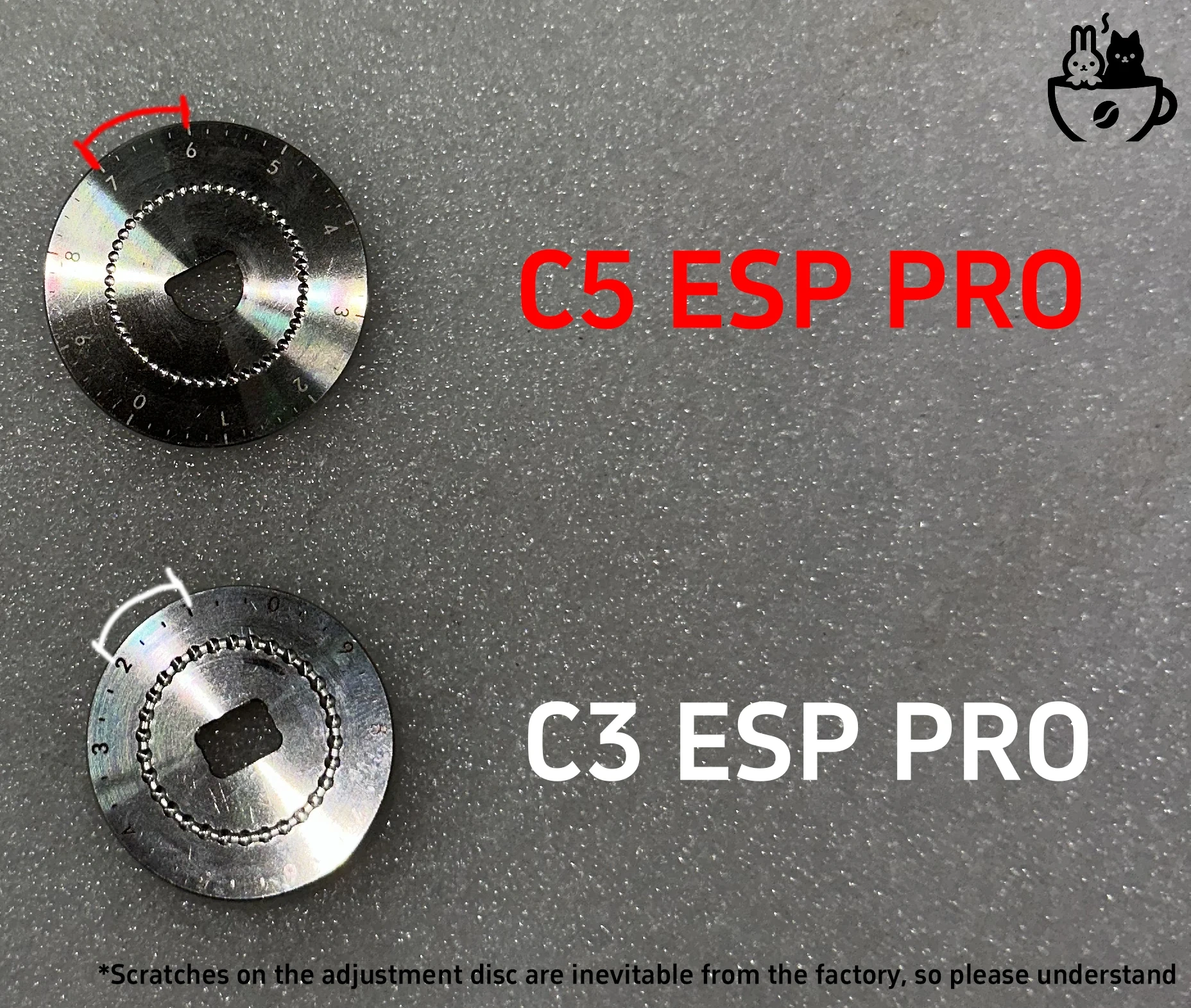 A1: C5 ESP PRO features ultra-fine 0.015mm adjustment per click, compared to 0.0233mm on C3 ESP PRO — for more precise espresso tuning.