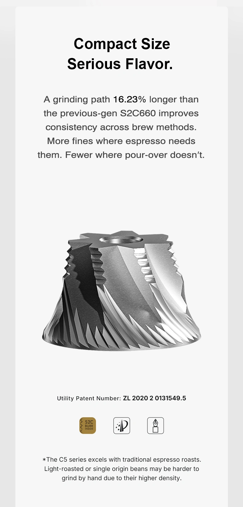 Equipped with patented S2C-042-III stainless steel burrs with higher precision and efficiency. C5 ESP Pro hand coffee grinder provides more precise grinding adjustment, minor adjustment of 0.015mm per click allows you to easily achieve the perfect coarseness for your preferred fine to coarse. From French press to espresso coffee, TIMEMORE has you covered